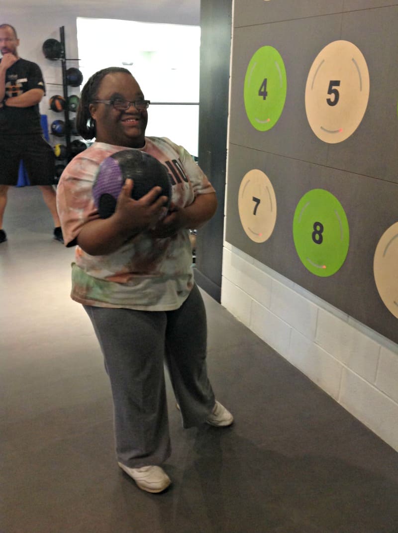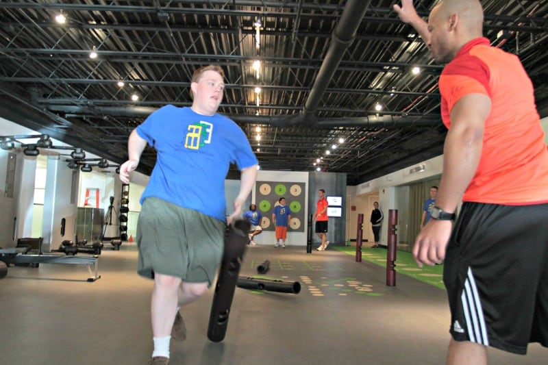 Some of the equipment used during sessions at Midtown included Pavigym censored walls and flooring, weighted rope, sandbags, hurdles, agility rings, Vipr weights, punching bag, vibration plates, and more. “Their equipment is not necessarily created for individuals with disabilities, but they found ways to adapt the activities for the Warriors,” said Pierce.
