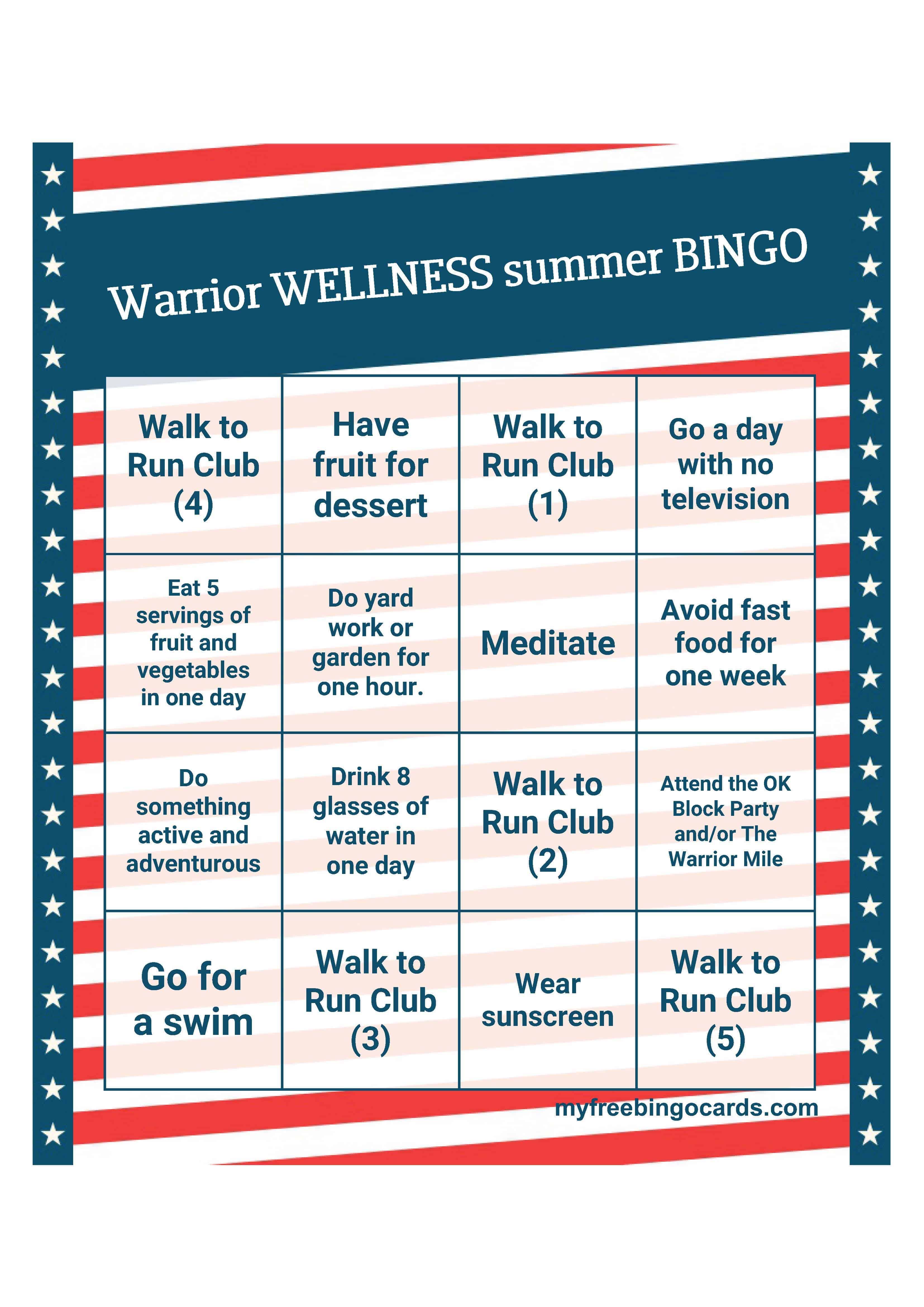 Complete 4 wellness goals in a row/vertical/diagonal for a wellness prize! Complete the entire card and be entered in a drawing for a super wellness prize!