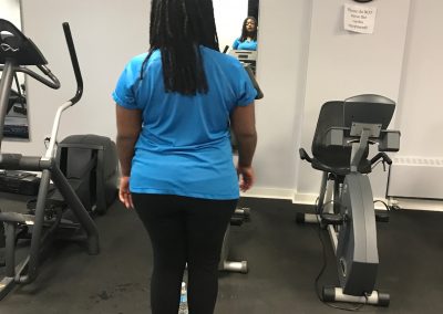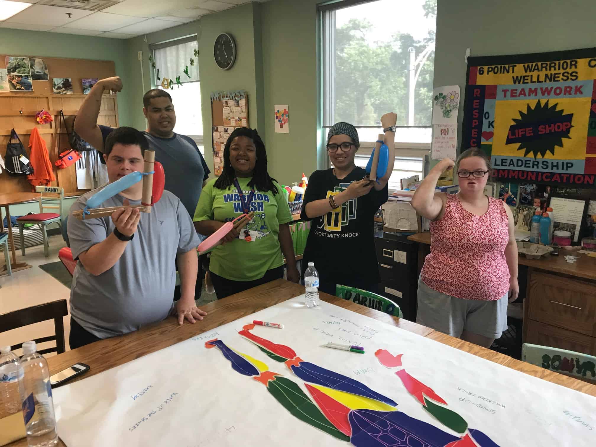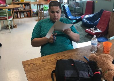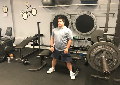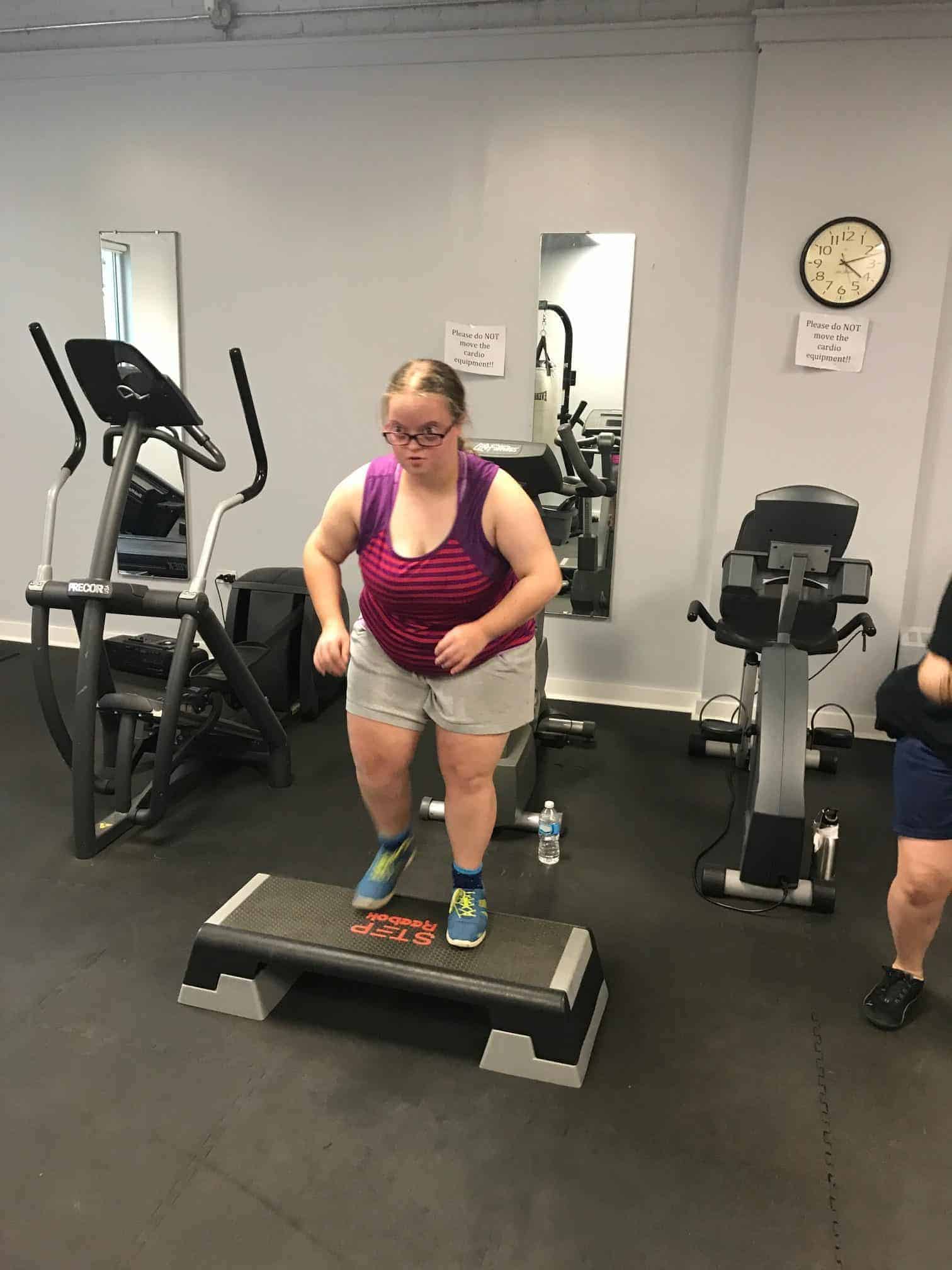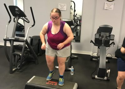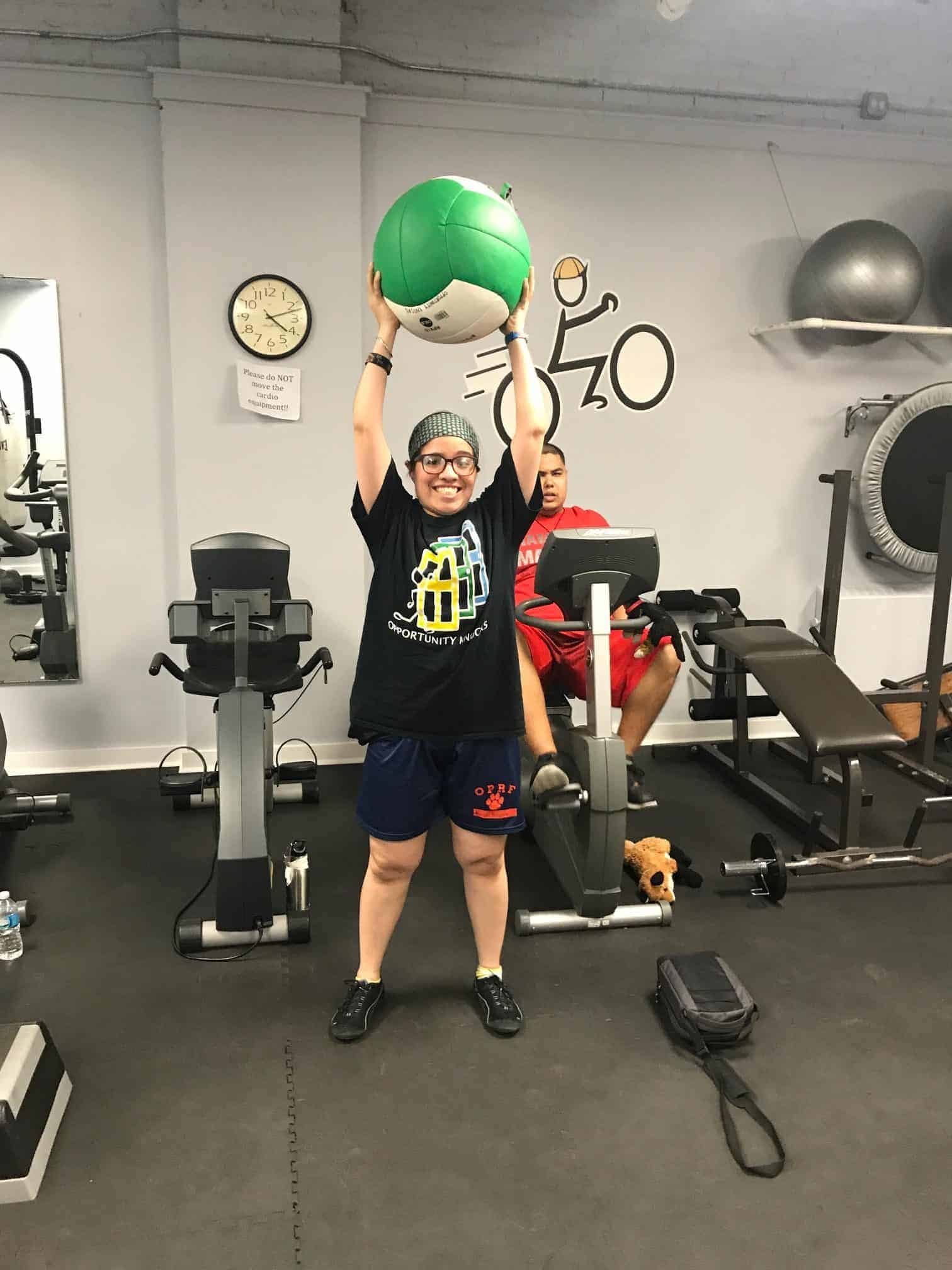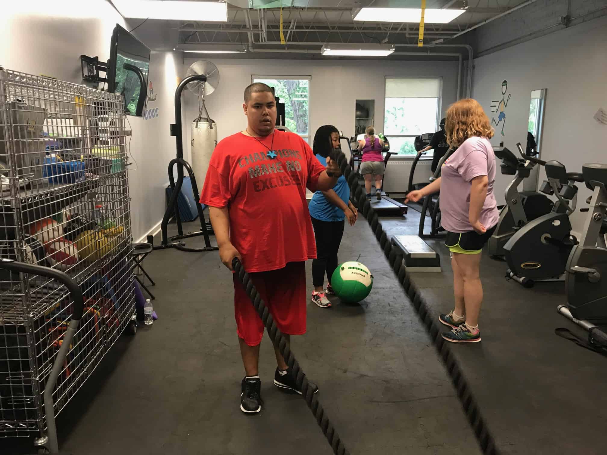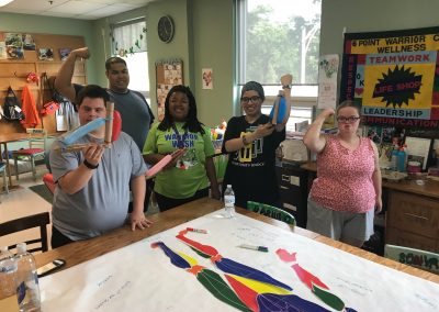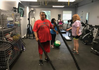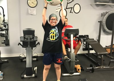 The fitness portion of this session of Workout Warriors focused on circuit training -a combination of aerobic training and muscle strengthening. We start each 35 minute workout session with a dynamic warm up of arm circles, jumping jacks, running in place and other activities that get our blood flowing. Exercises included using the battle rope, sit to stands on the bench, step ups, weighted ball slams, and the treadmill!