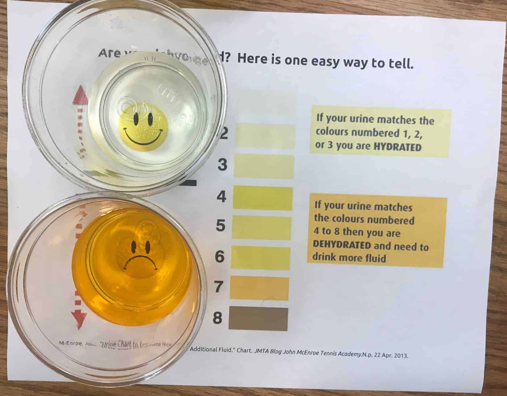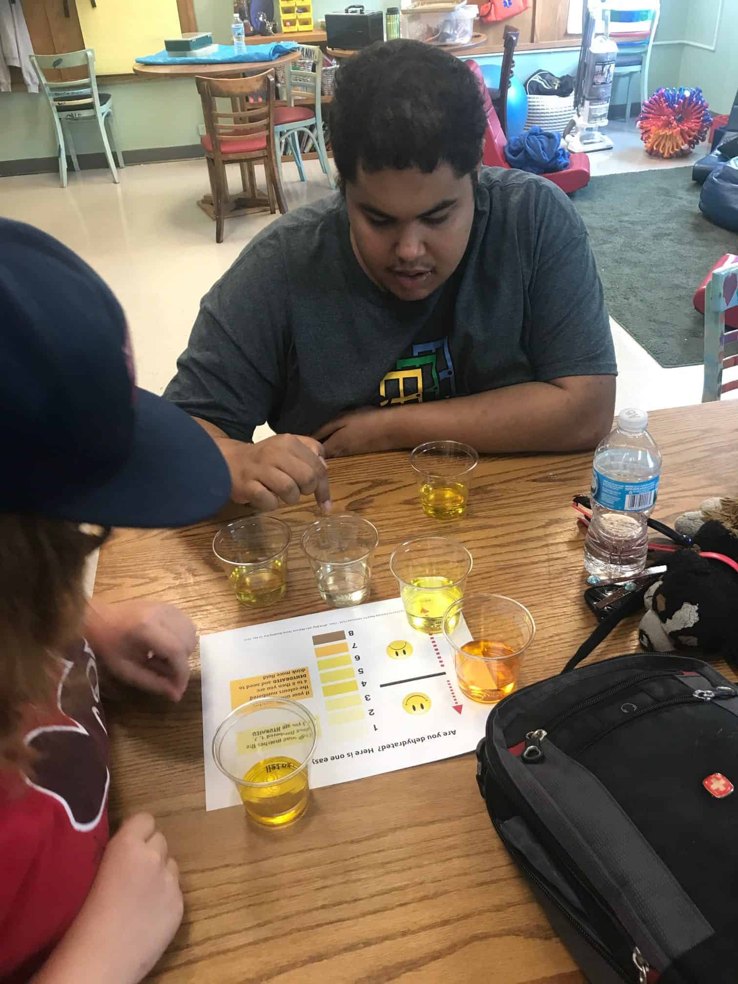 When it’s HOTTER drink WATER!! Our bodies dehydrate in the summer, and one of the best ways to determine if you are hydrated is the color of your pee!! We used yellow food coloring to help guide us on how to know when our bodies need more water!