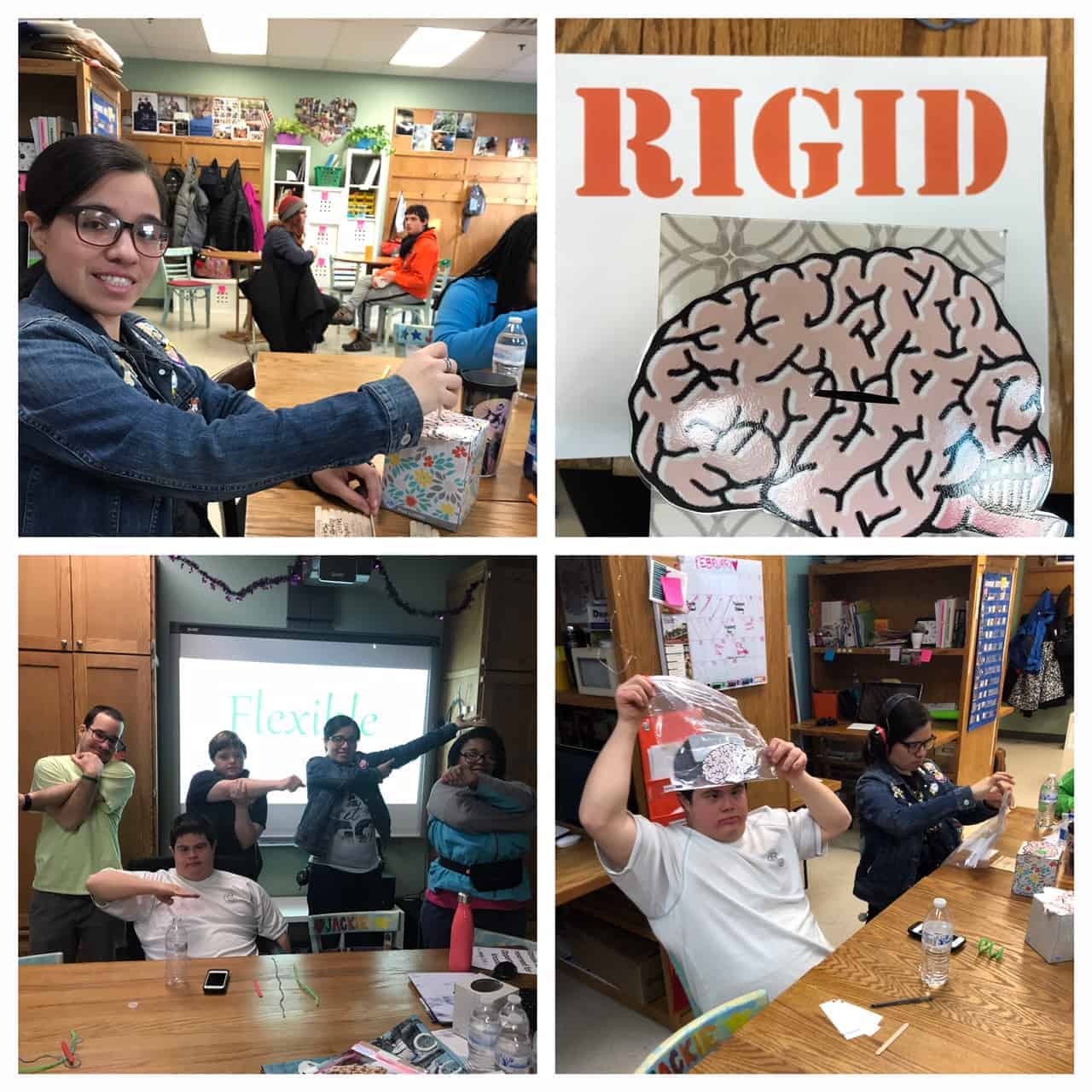 Warriors practiced flexible thinking by first writing out their rigid thoughts on popsicle sticks. These thoughts easily fit in our rigid brains but did not leave room for any flexible thinking. Flexible brains easily allowed in lots of flexible and new thoughts!