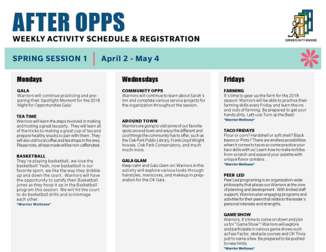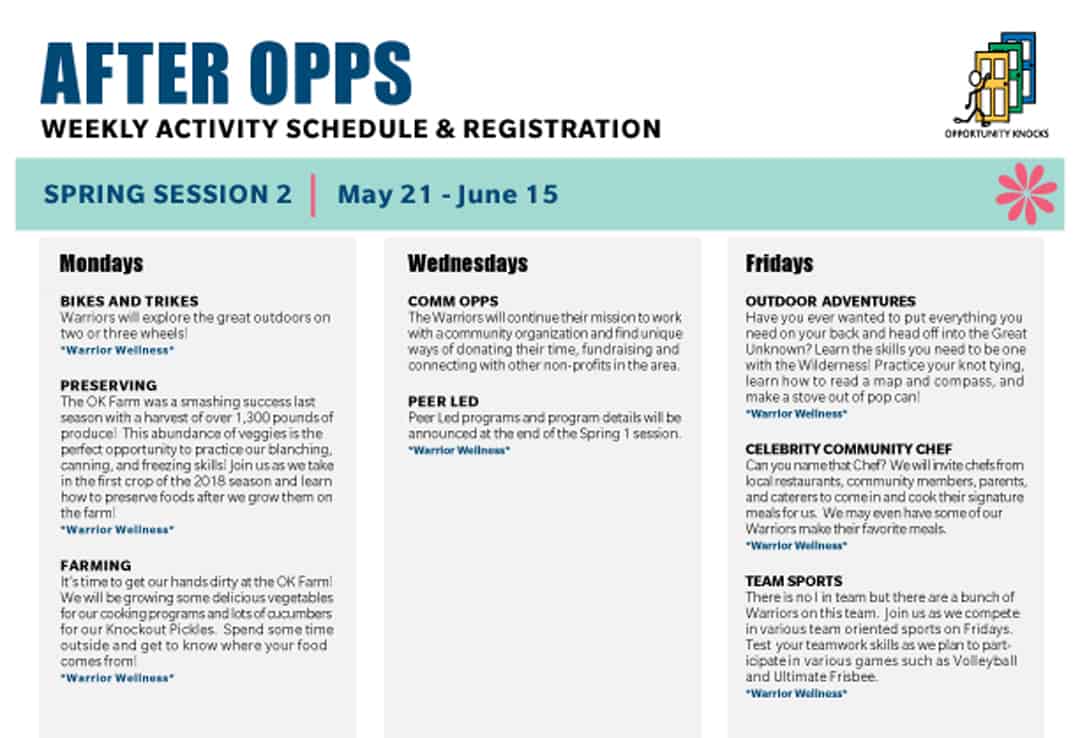 Registration for the OK After Opps Spring Season, Sessions 1 & 2 is now open! See descriptions of activities being offered below. Please use the form on this page to register for either or both of these After Opps program sessions. Any questions or concerns may be directed to Mike Carmody by email at mike@opportunityknocksnow.org