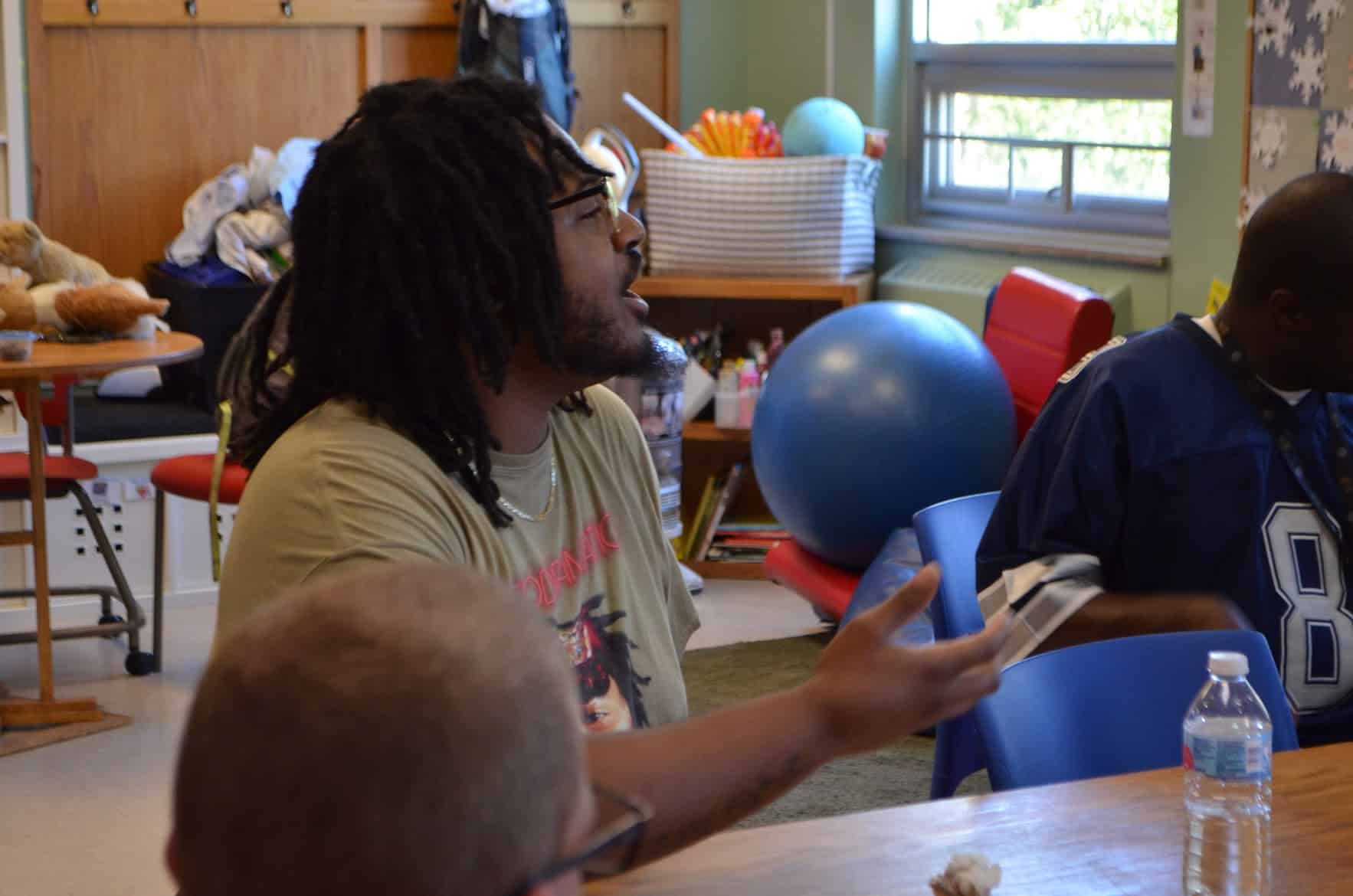 Warriors in Hip-Hop learned about the “4 elements” of Hip-Hop (DJing, Rapping, Graffiti Art, and Breakdancing) and some Chicago Hip-Hop history. Local rappers Mfn Melo and Defcee also came in and shared their craft, freestyled with us, and helped us prepare a group rap song for our Family Day performance. Thanks for kickin it with us, gentlemen!