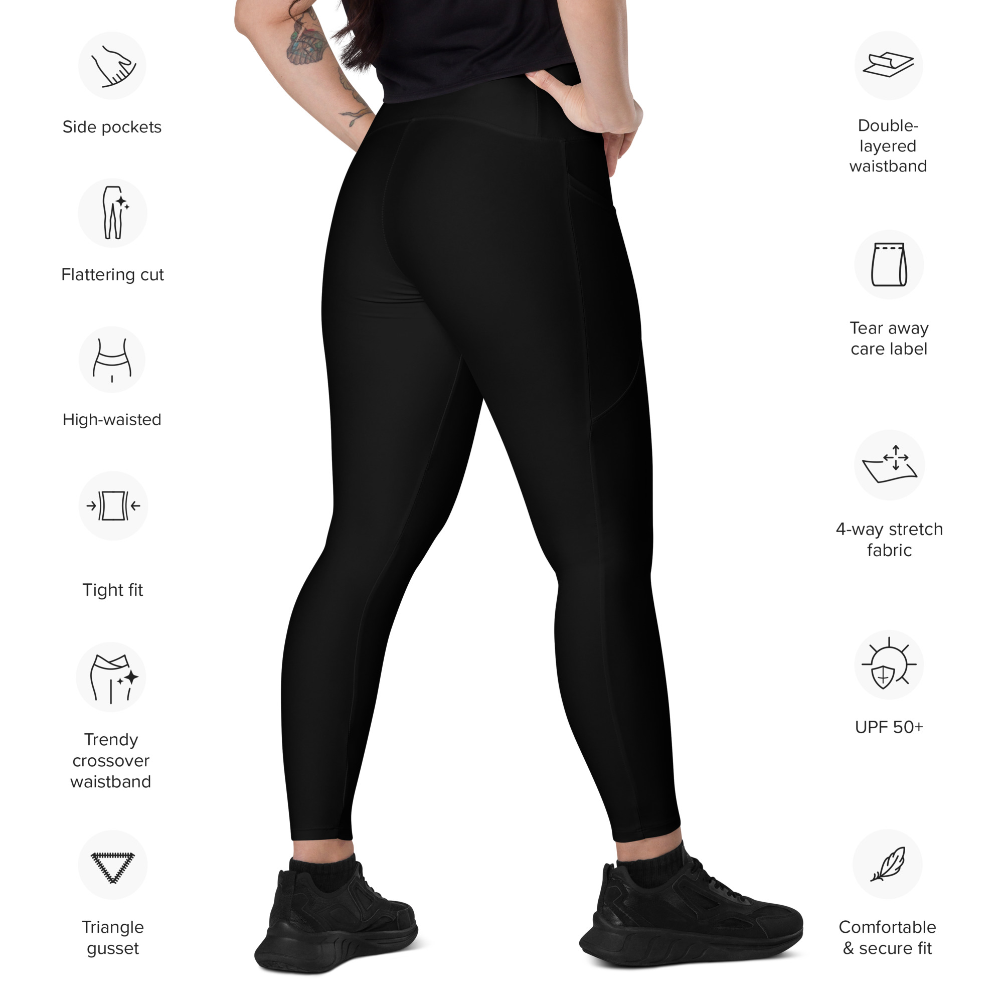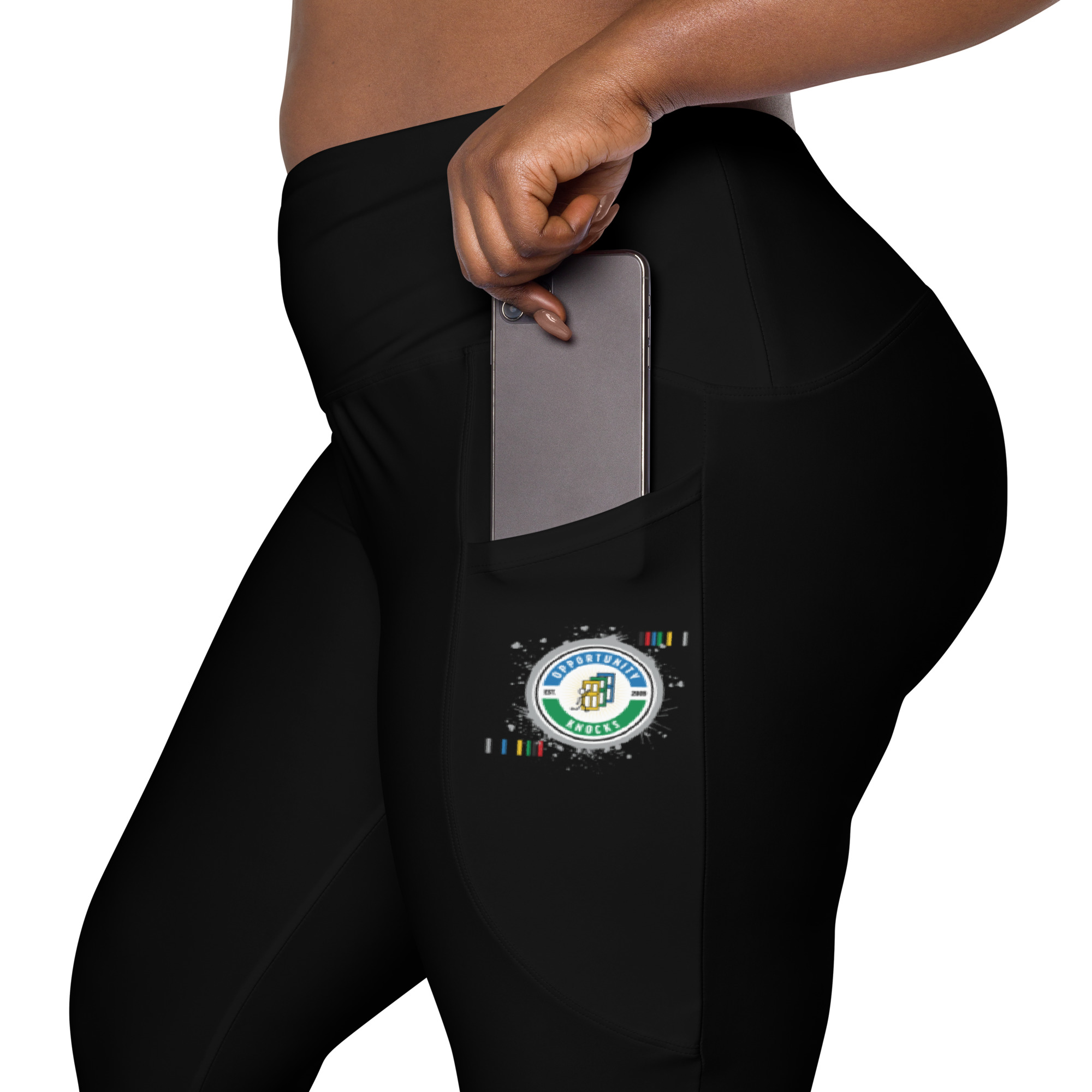 Treat yourself with the trendy and flattering crossover leggings with pockets. Feel exceptional comfort all through your training and keep your valuables close with the practical side pockets. Features the Dripped Out OK Logo on the left pocket of these slick black leggings.